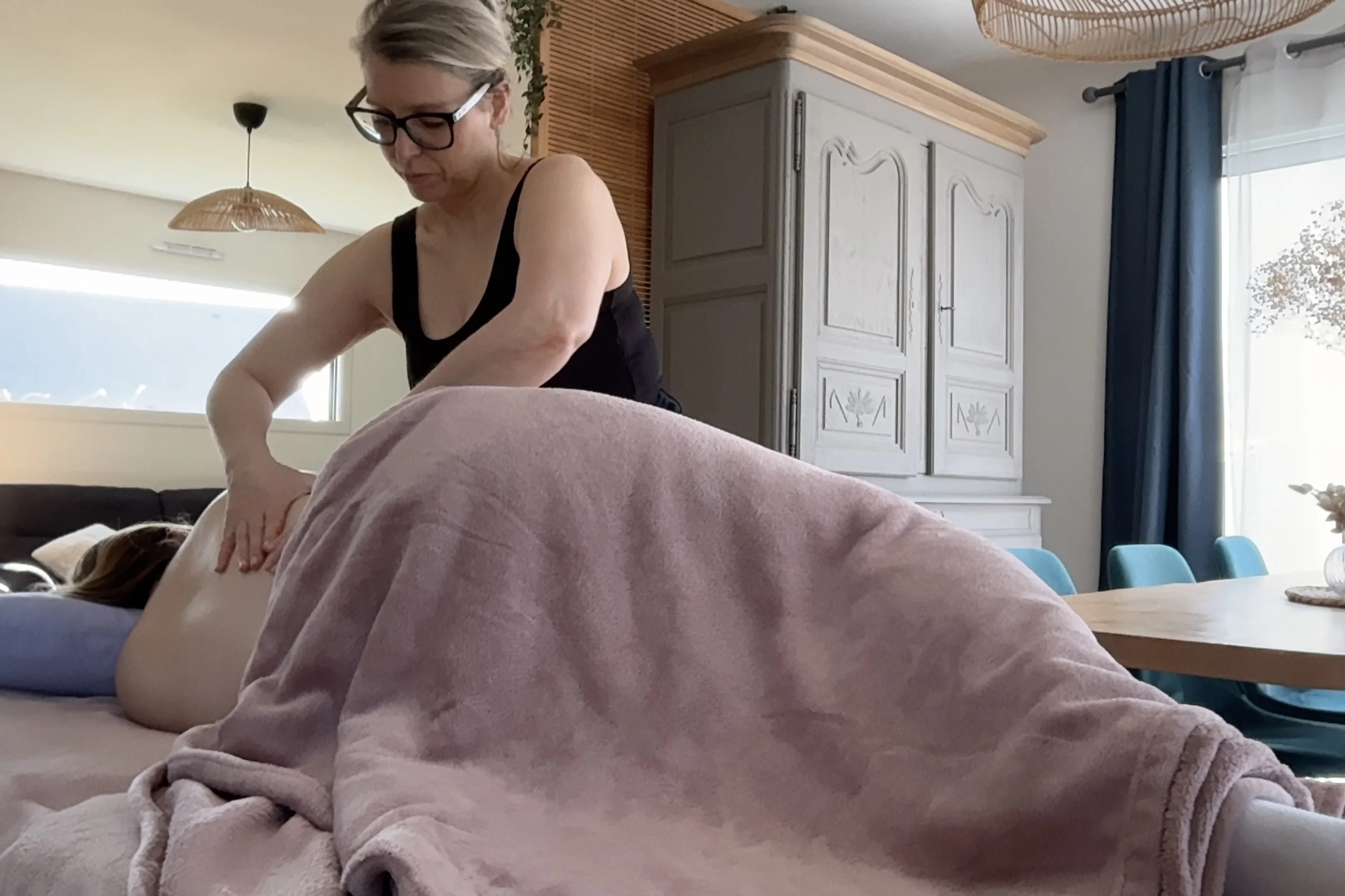 Séances recommandées dès le deuxième trimestre ; avis médical nécessaire en cas de pathologie. Rythme conseillé : une à deux fois par semaine ou tous les quinze jours selon vos besoins. Je me déplace à domicile dans un rayon de 50 km autour de Caen.